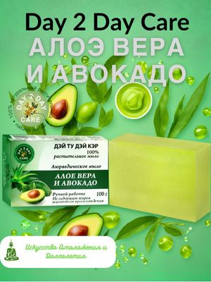 Аюрведическое Натуральное мыло Day 2 Day Care Алоэ Вера и Авокадо бережно очищает, увляжняет и питает Вашу кожу, оно не содержит жиров животного происхождения, красящих веществ, искусственных ароматизаторов и химических добавок. Имеет естественный цвет и запах.