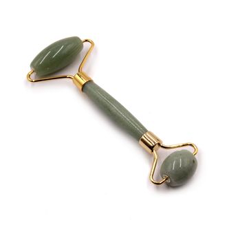 Двойной роллер для лица из натурального нефрита с металлическим родированным креплением в цвете желтого золота и силиконовыми прокладками для бесшумного движения ролика.